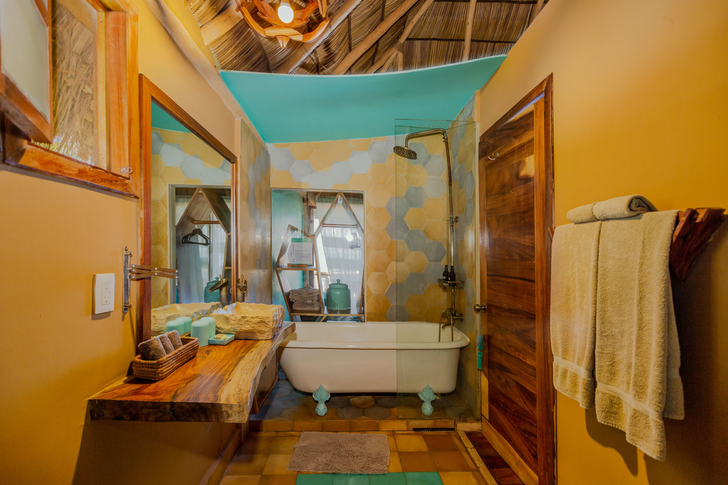 El baño privado incluye una relajante tina y productos de baño 100% ecológicos, que cuidan de ti y del medio ambiente.